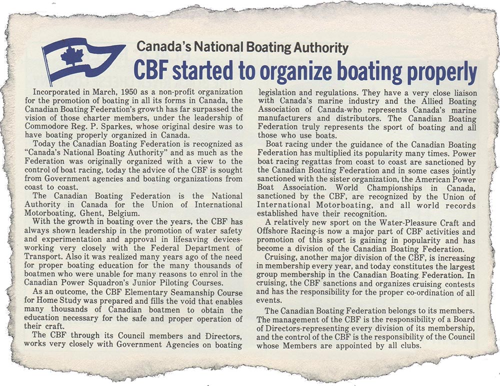 Incorporated in March, 1950 as a non-profit organization for the promotion of boating in all its forms in Canada, the Canadian Boating Federation's growth has far surpassed the vision of those charter members, under the leadership of Commodore Reg. P. Sparkes, whose original desire was to have boating properly organized in Canada.